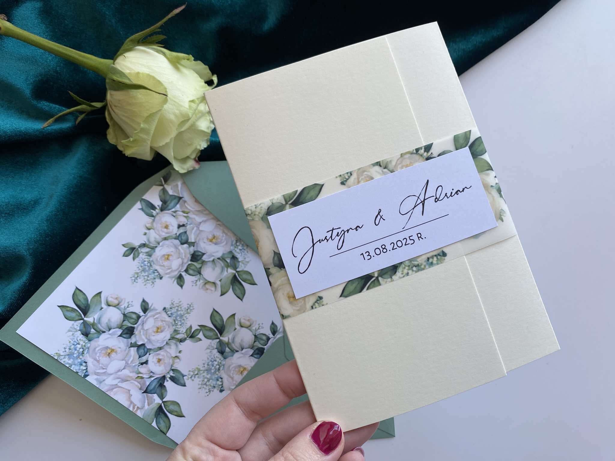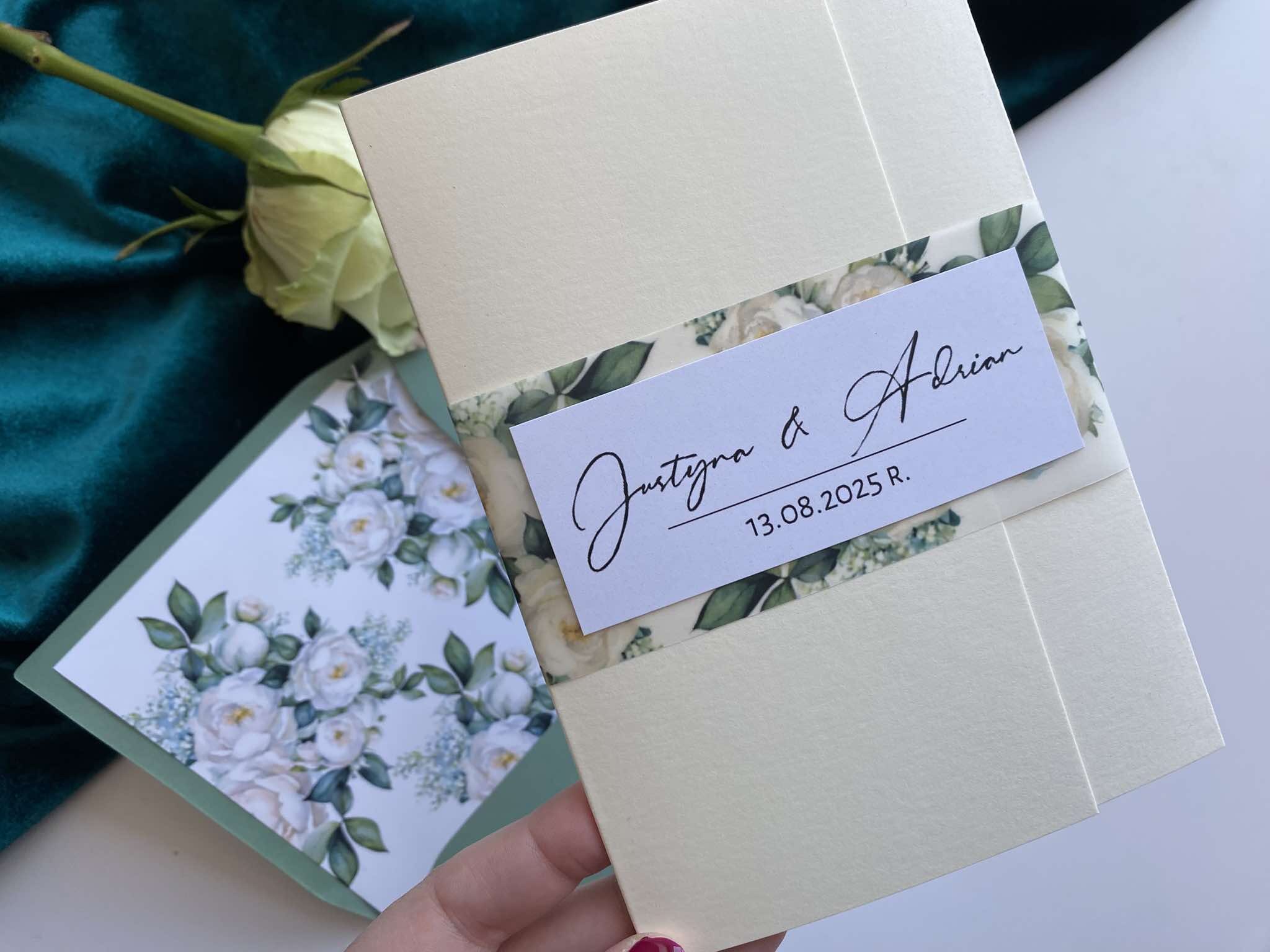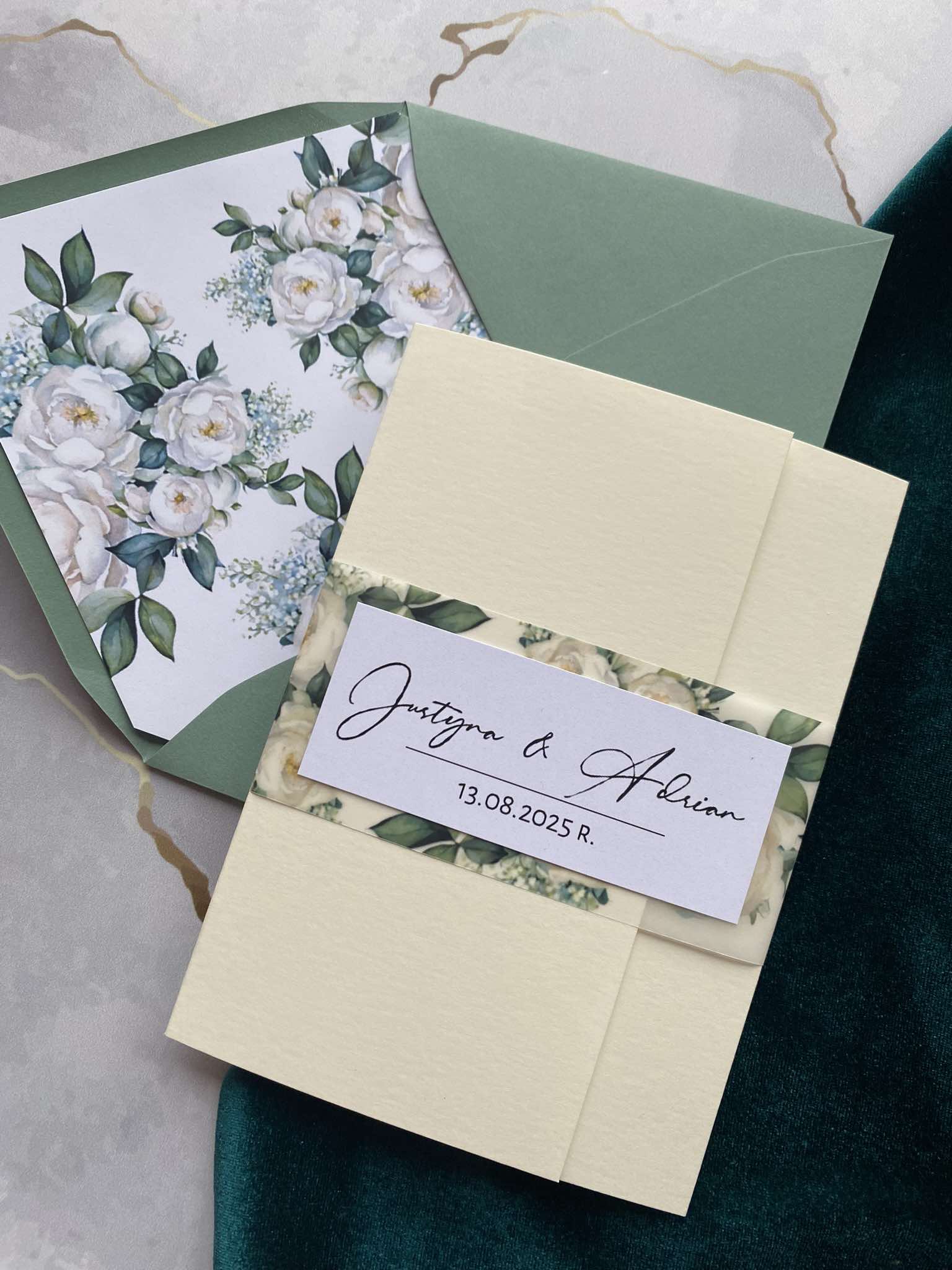 Cena zawiera zaproszenie otwierane z delikatną kalkową przepaską w motywie kwiatowym z imionami oraz personalizację.