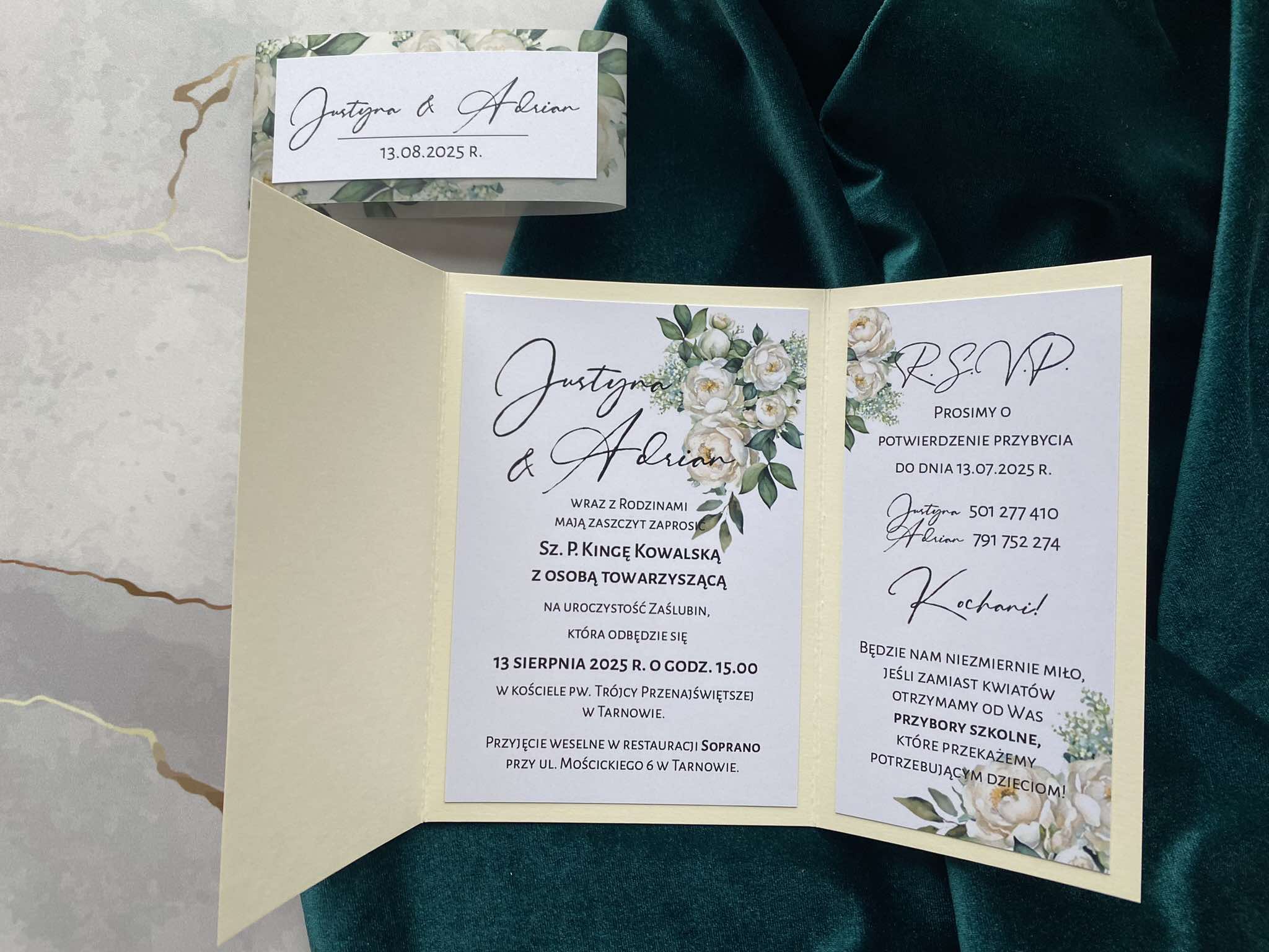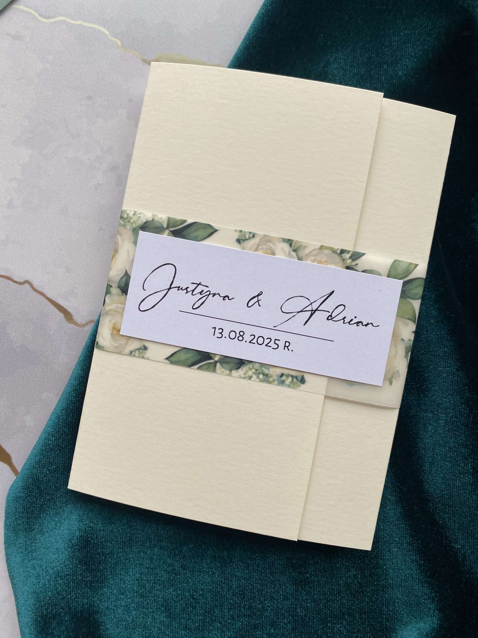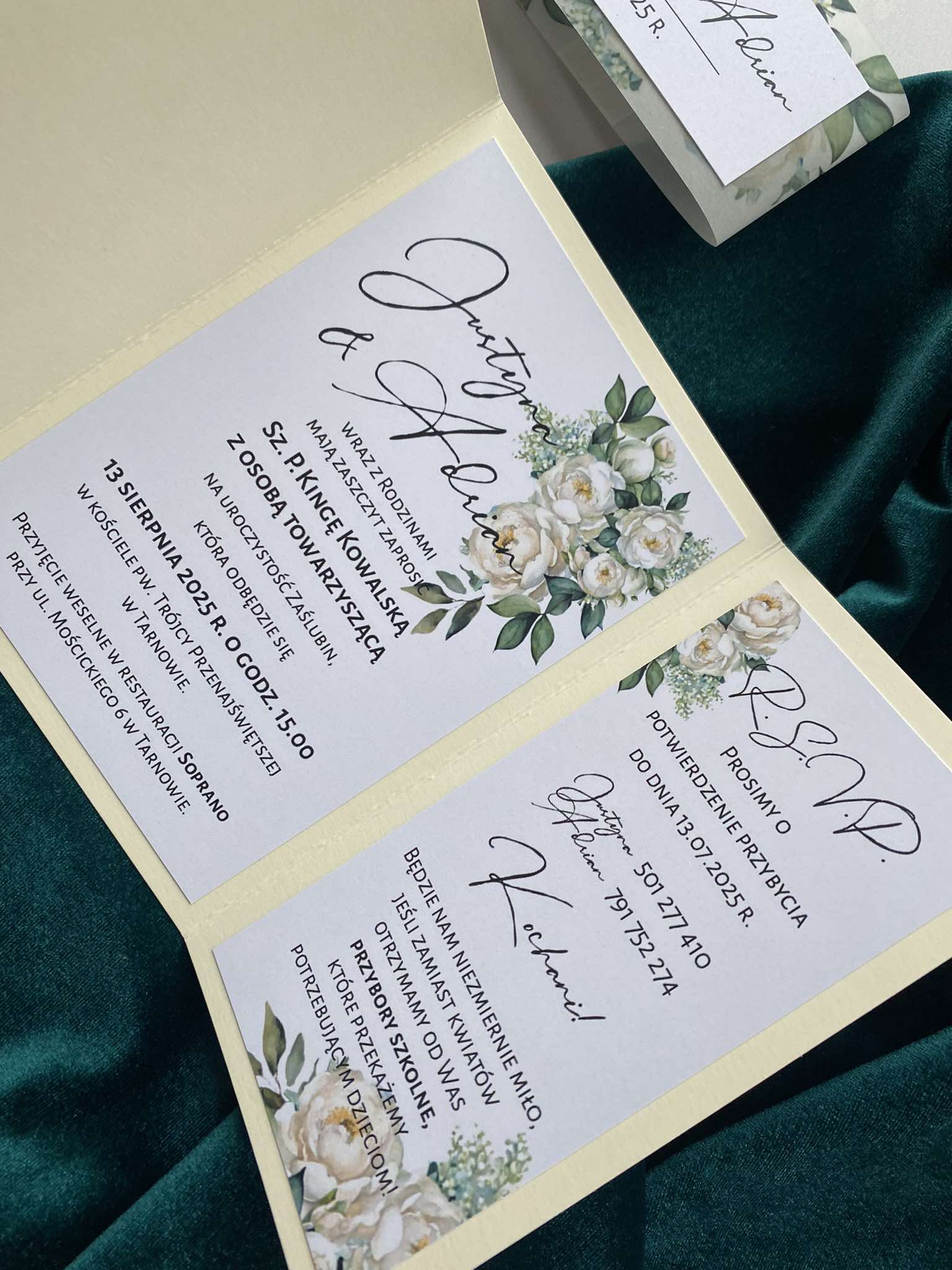 Cena zawiera zaproszenie otwierane z delikatną kalkową przepaską w motywie kwiatowym z imionami oraz personalizację.
