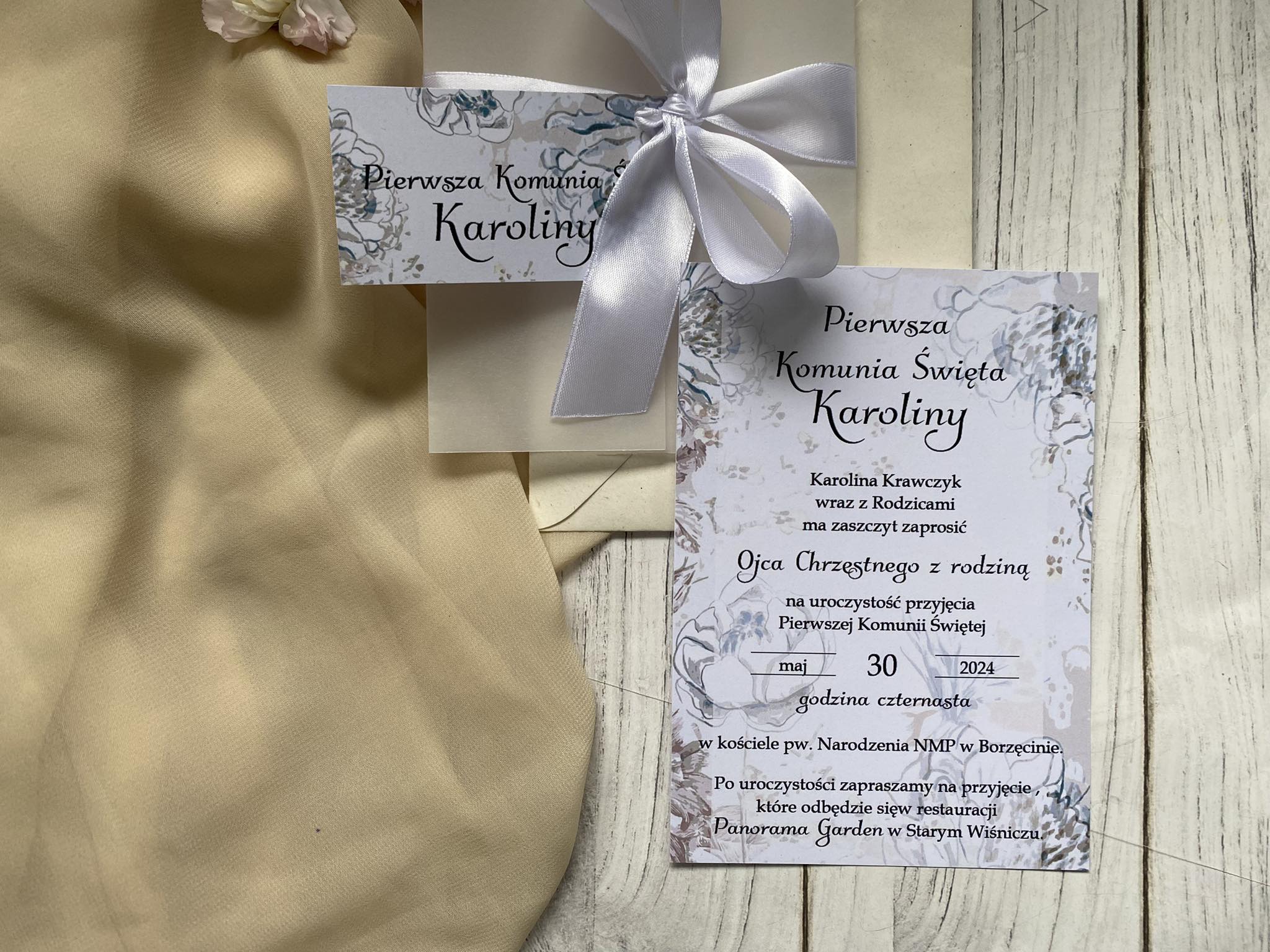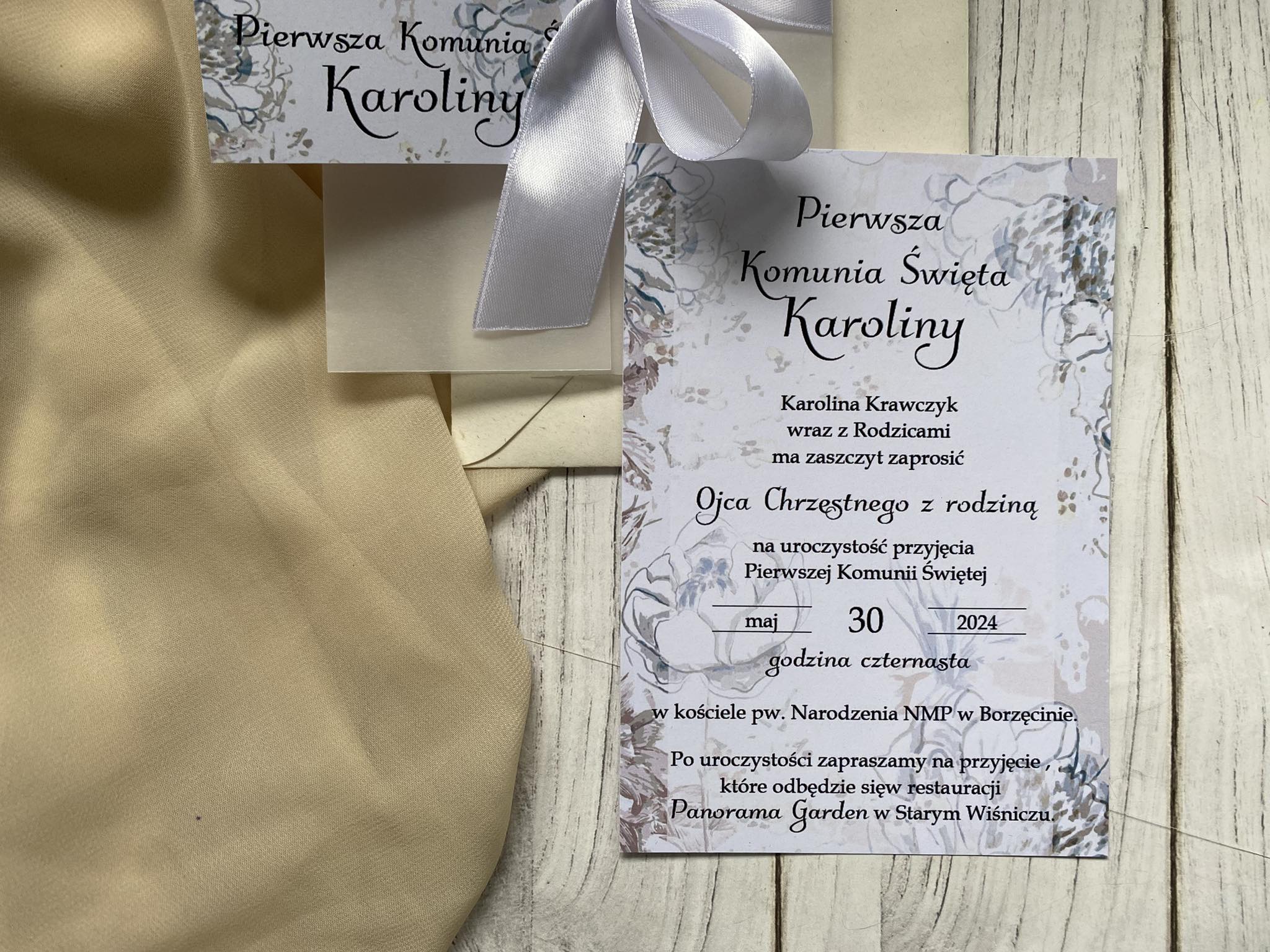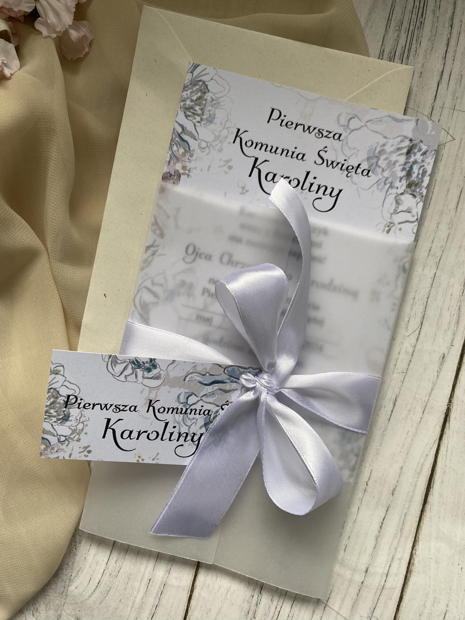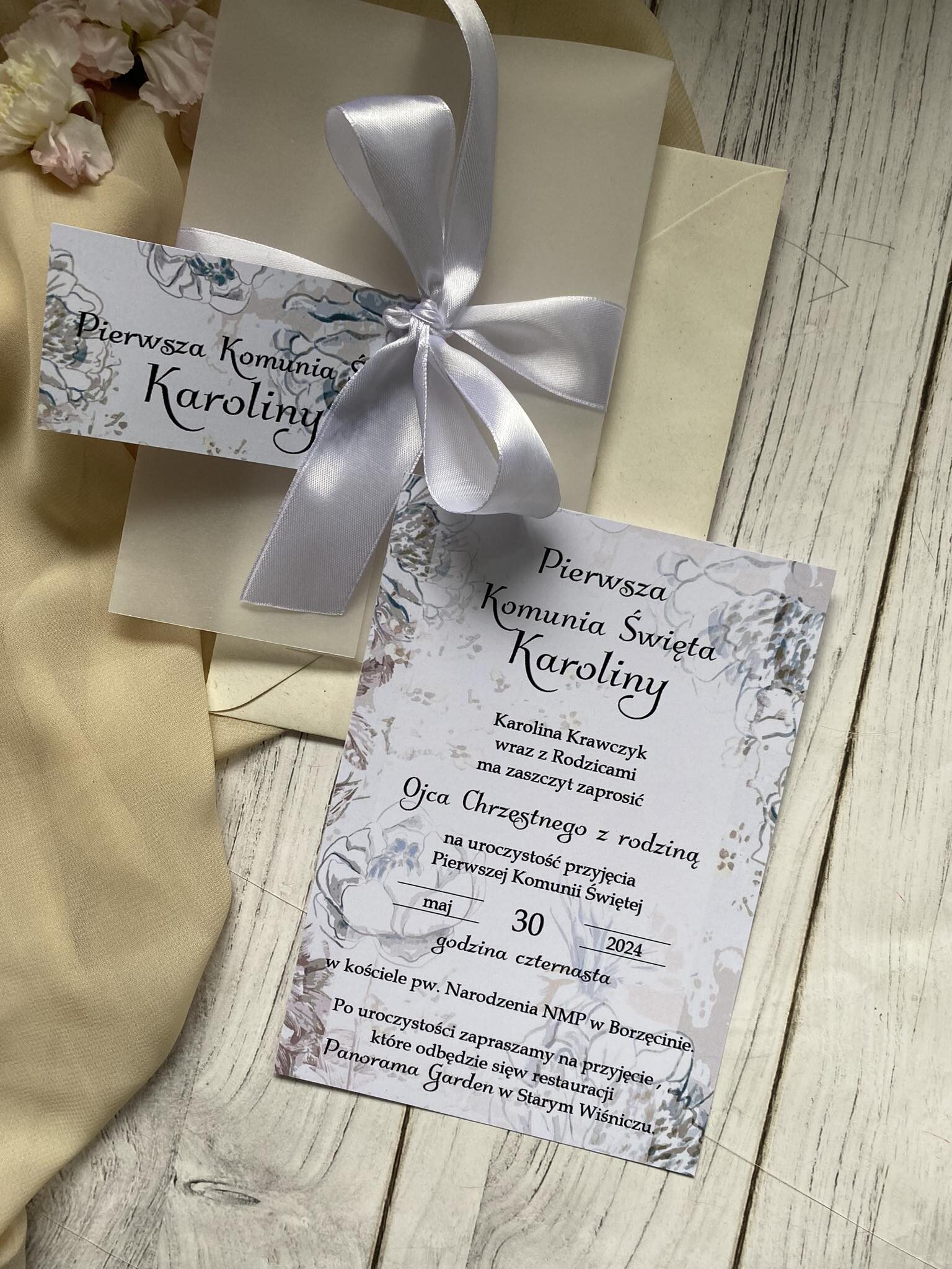Zaproszenie komunijne o wymiarach 12 cm na 17 cm w delikatnej kalce, w motywie kwiatowym w bieli i szarościach.