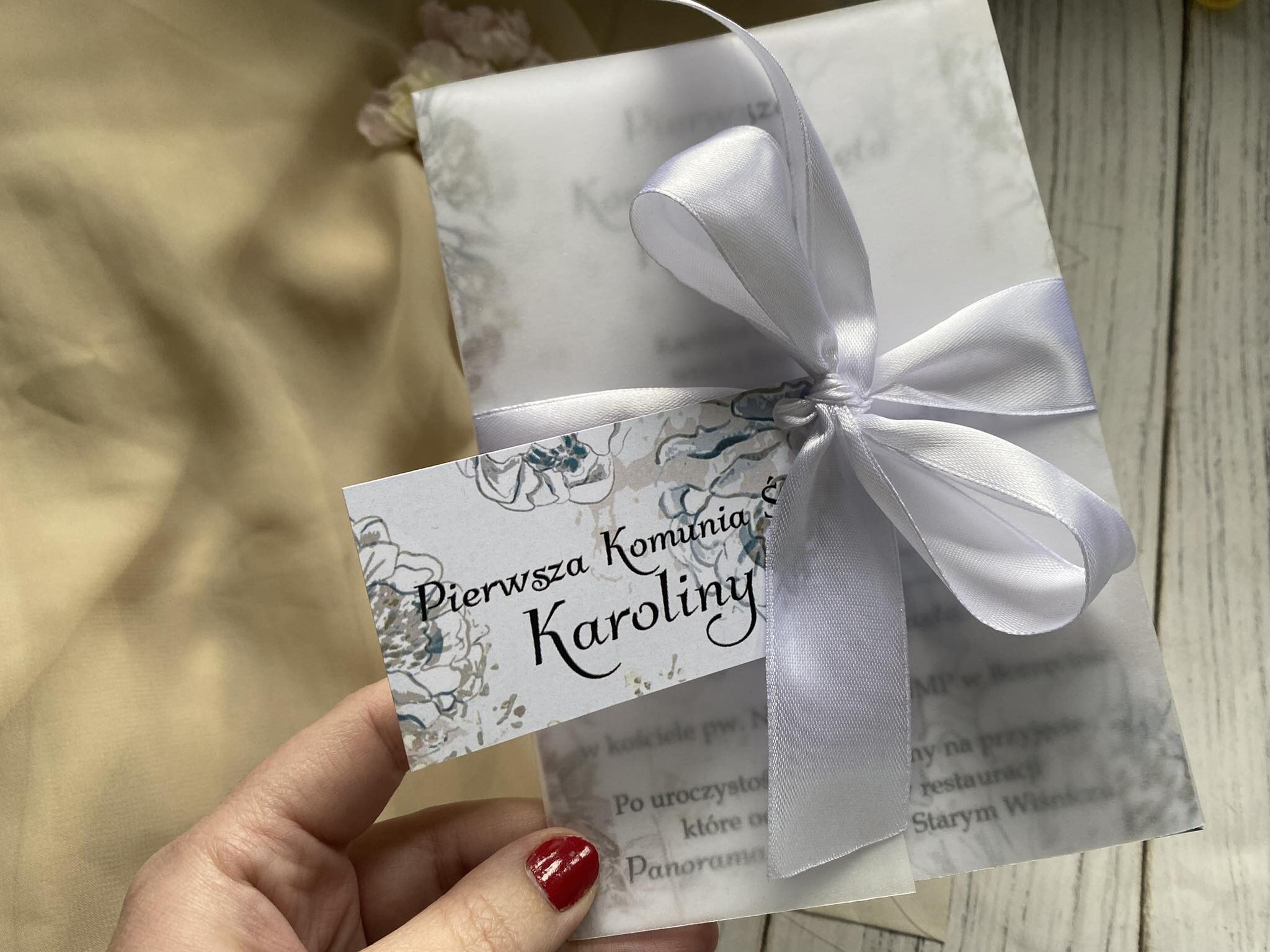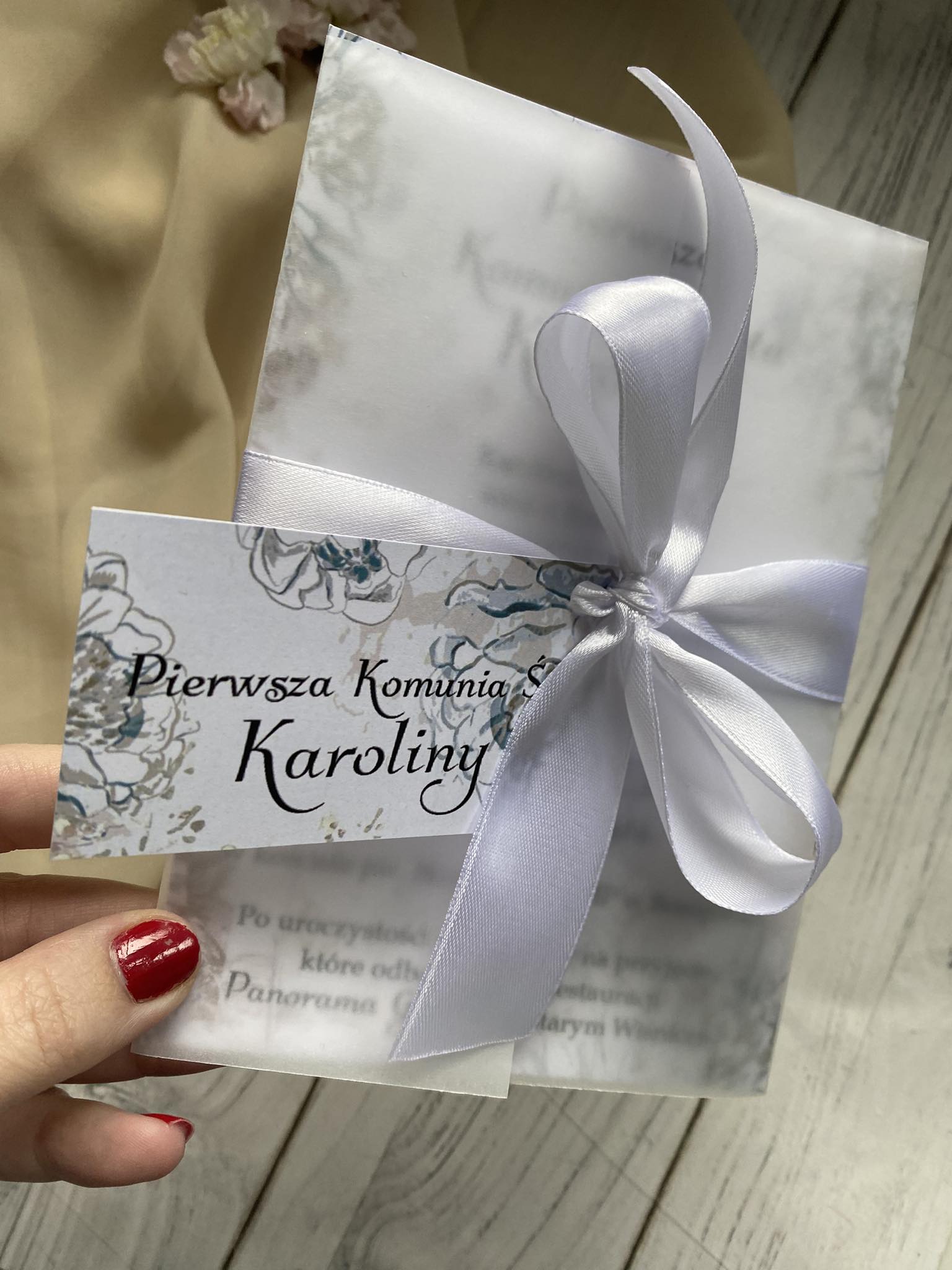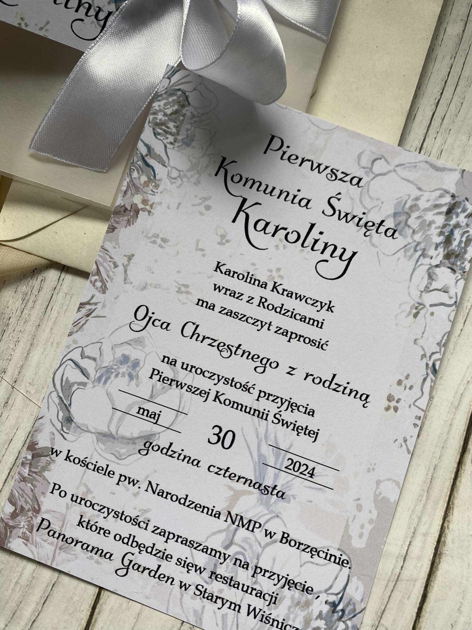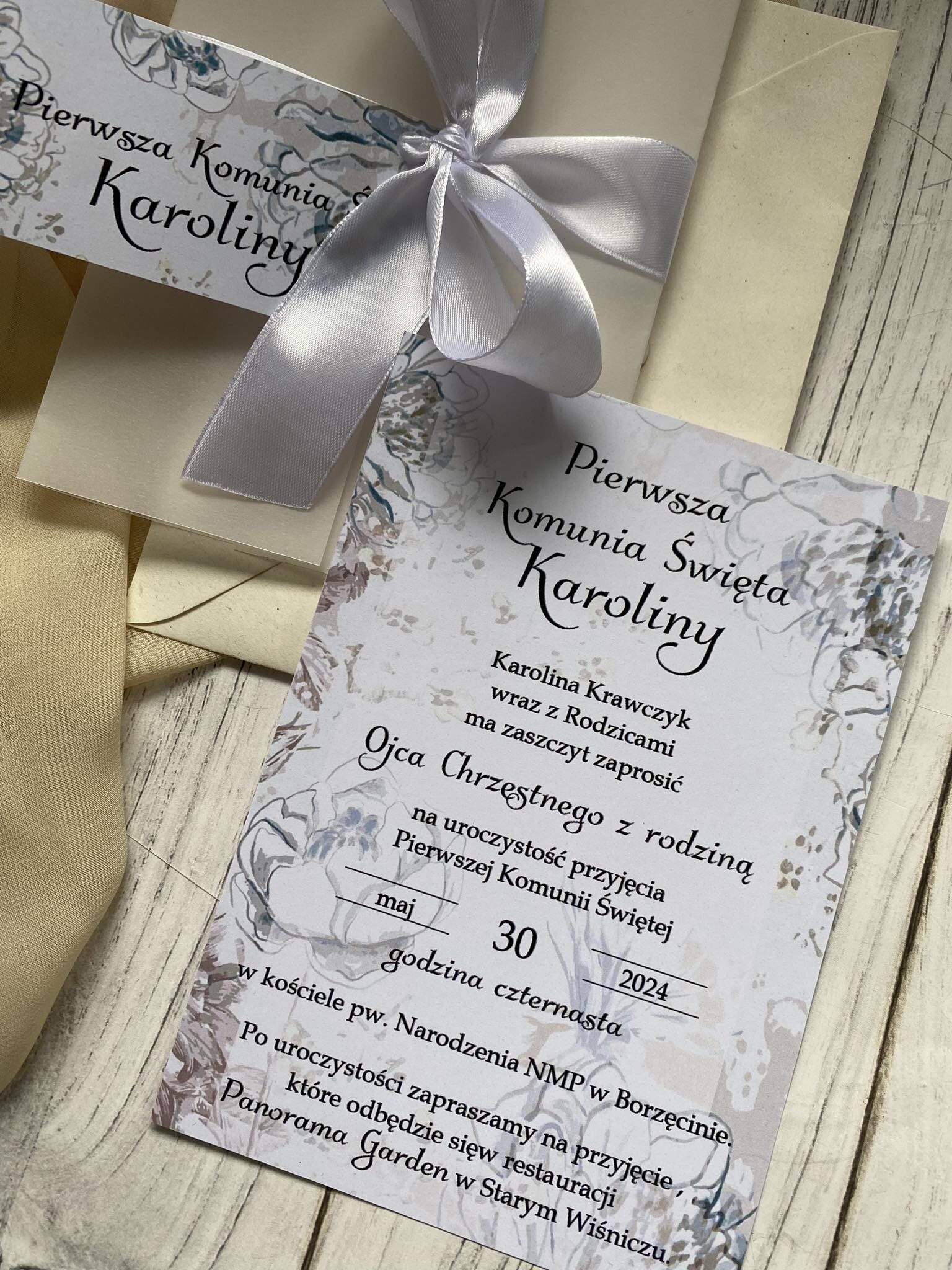 Zaproszenie komunijne o wymiarach 12 cm na 17 cm w delikatnej kalce, w motywie kwiatowym w bieli i szarościach.