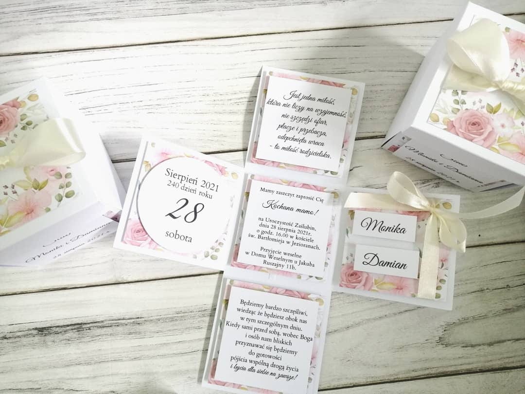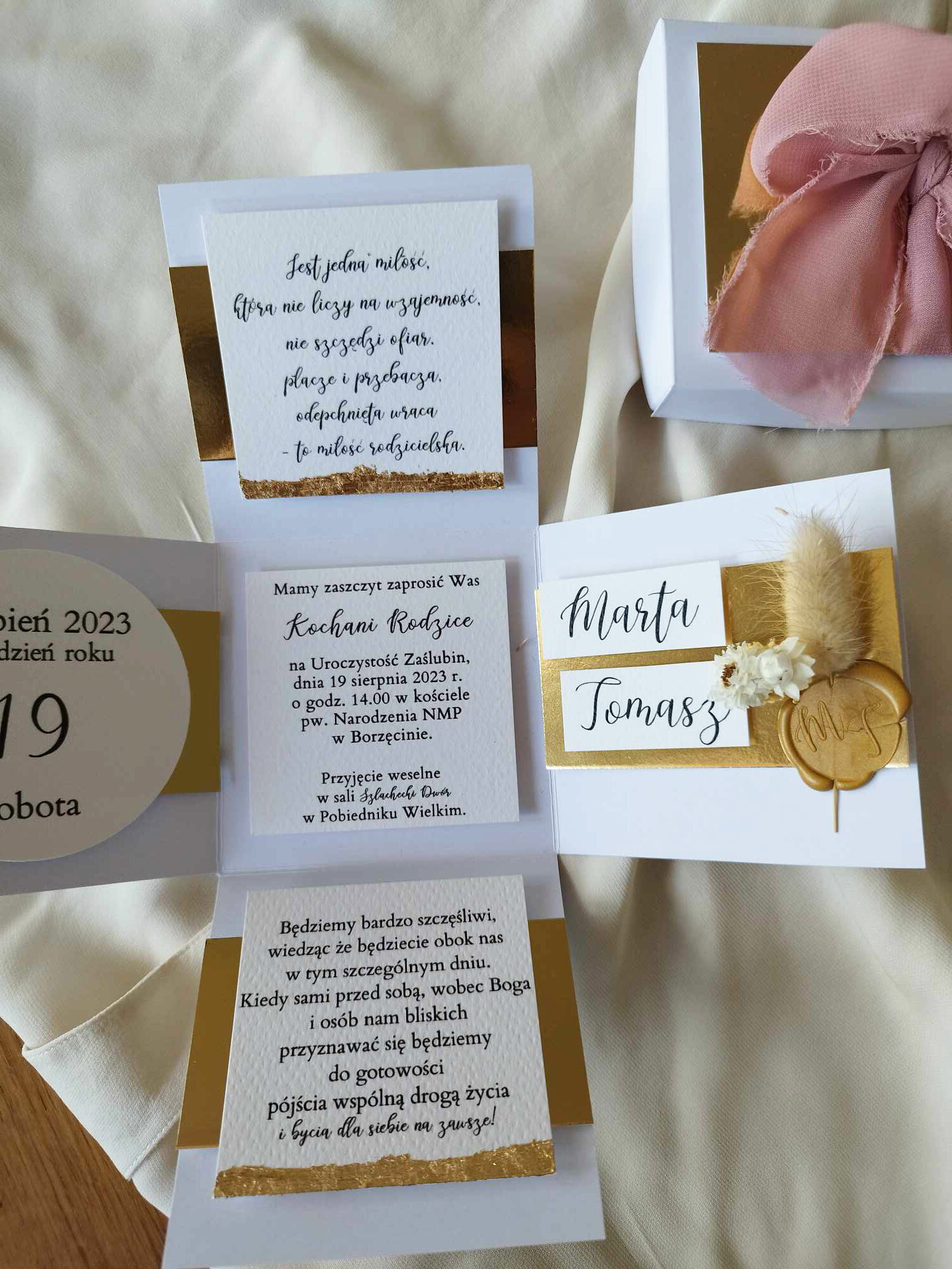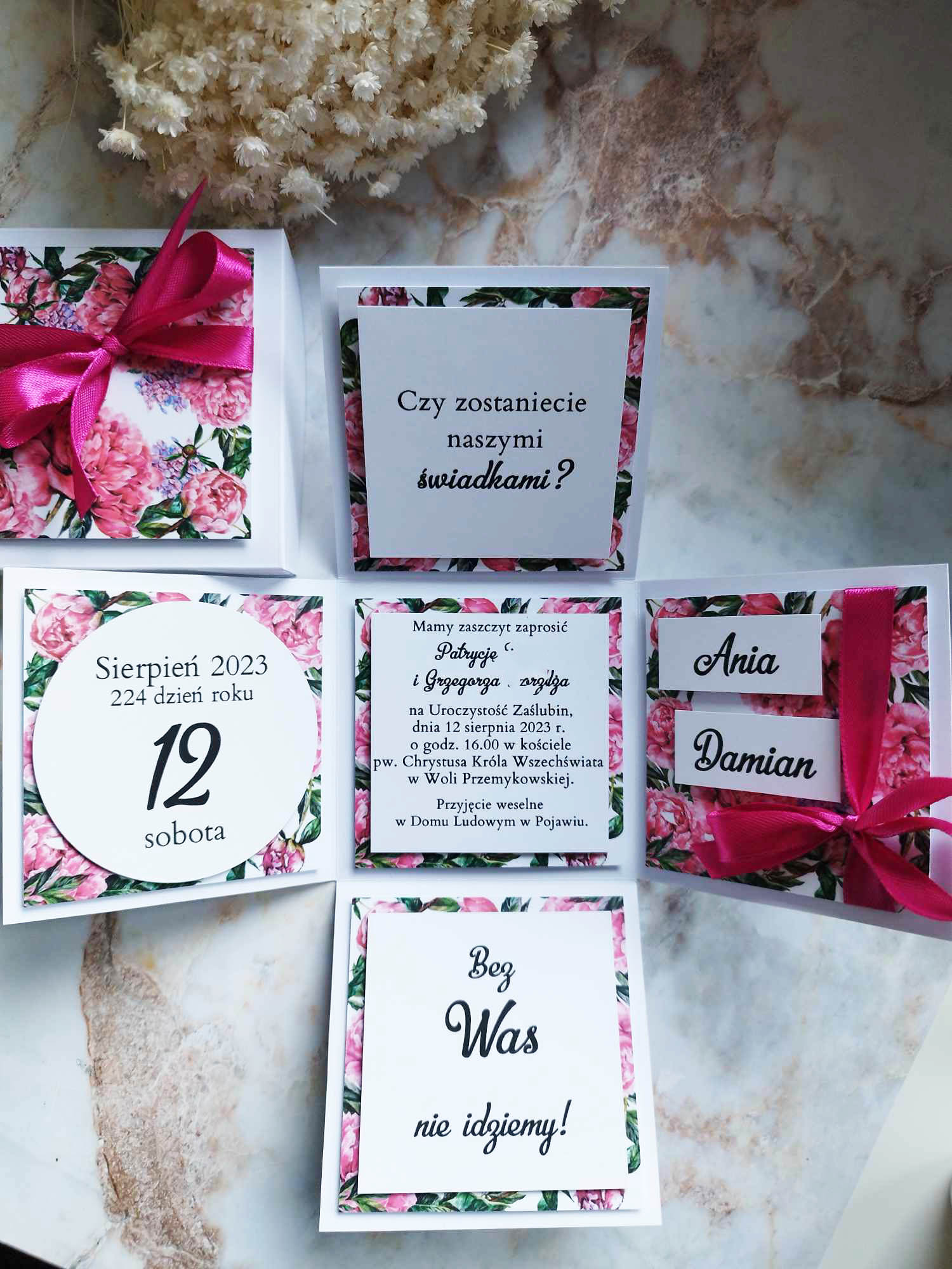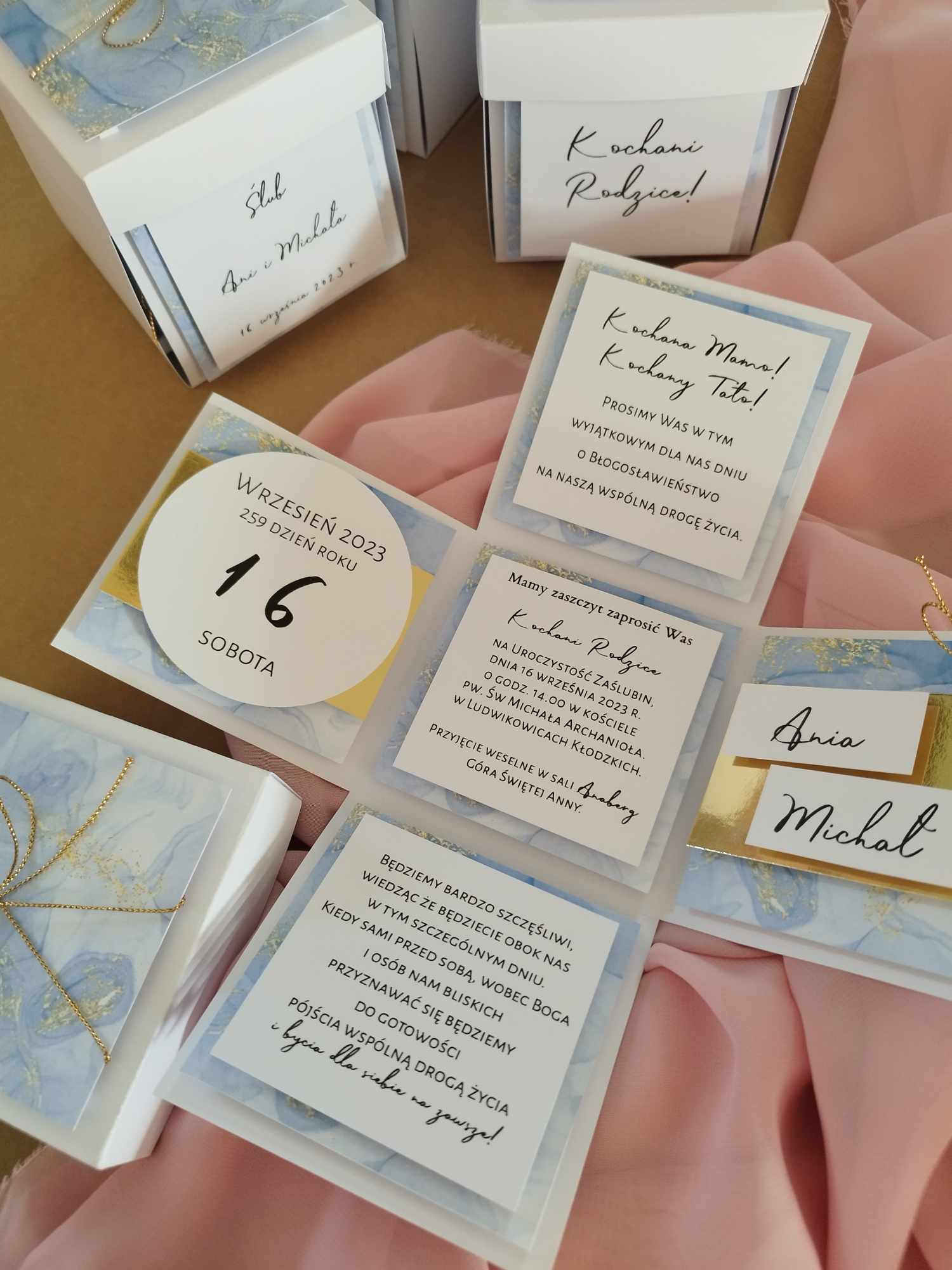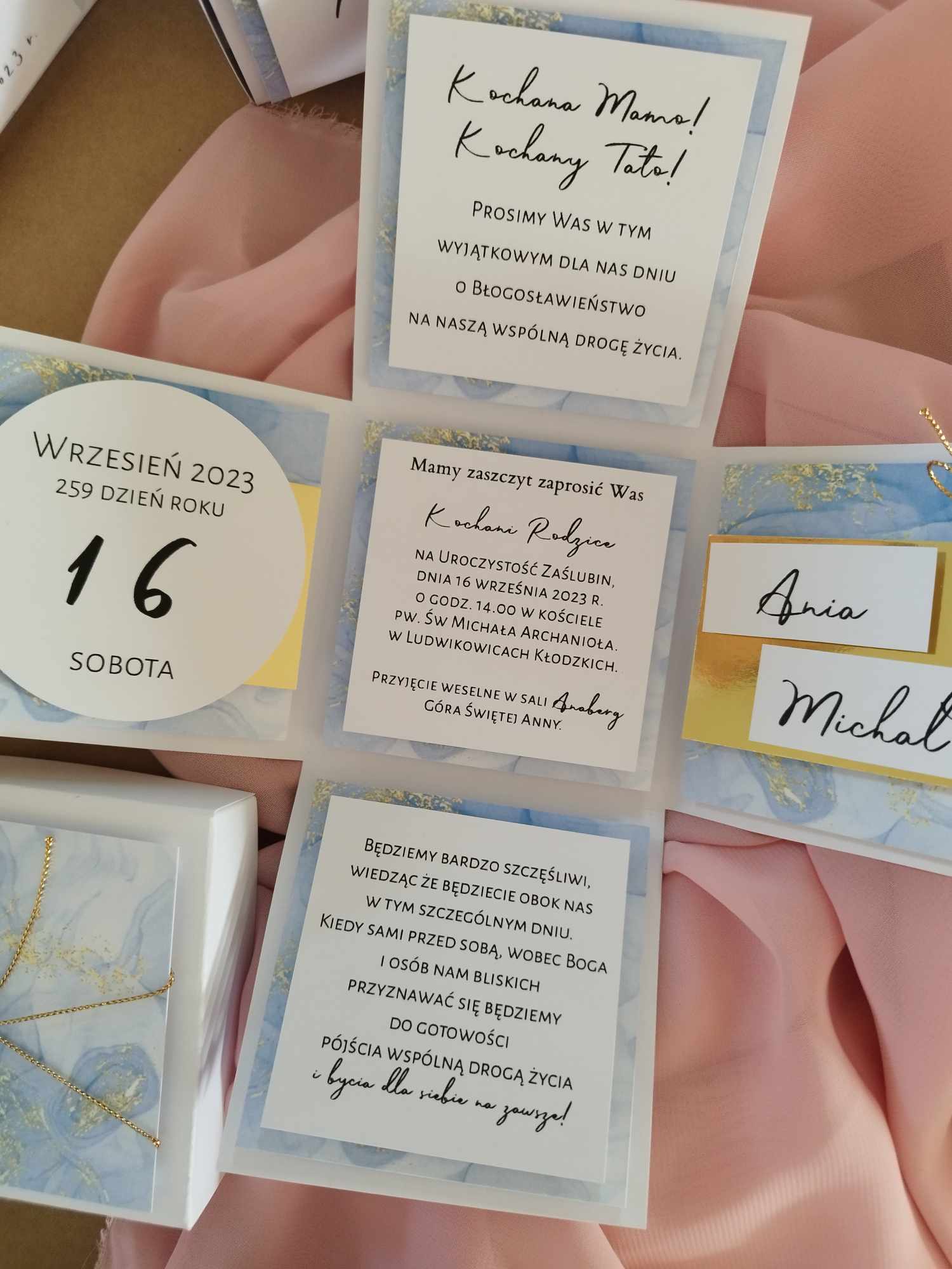 Zaproszenie dla Rodziców, Dziadków, Świadków w exploding box, o wymiarach 9 cm na 9 cm, po rozłożeniu 27 cm w motywie przewodnim zaproszeń. Może służyć również jako podziękowanie. Zawiera grafikę ślubną oraz teksty zaproszenia, podziękowania, prośbę o błogosławieństwo.
