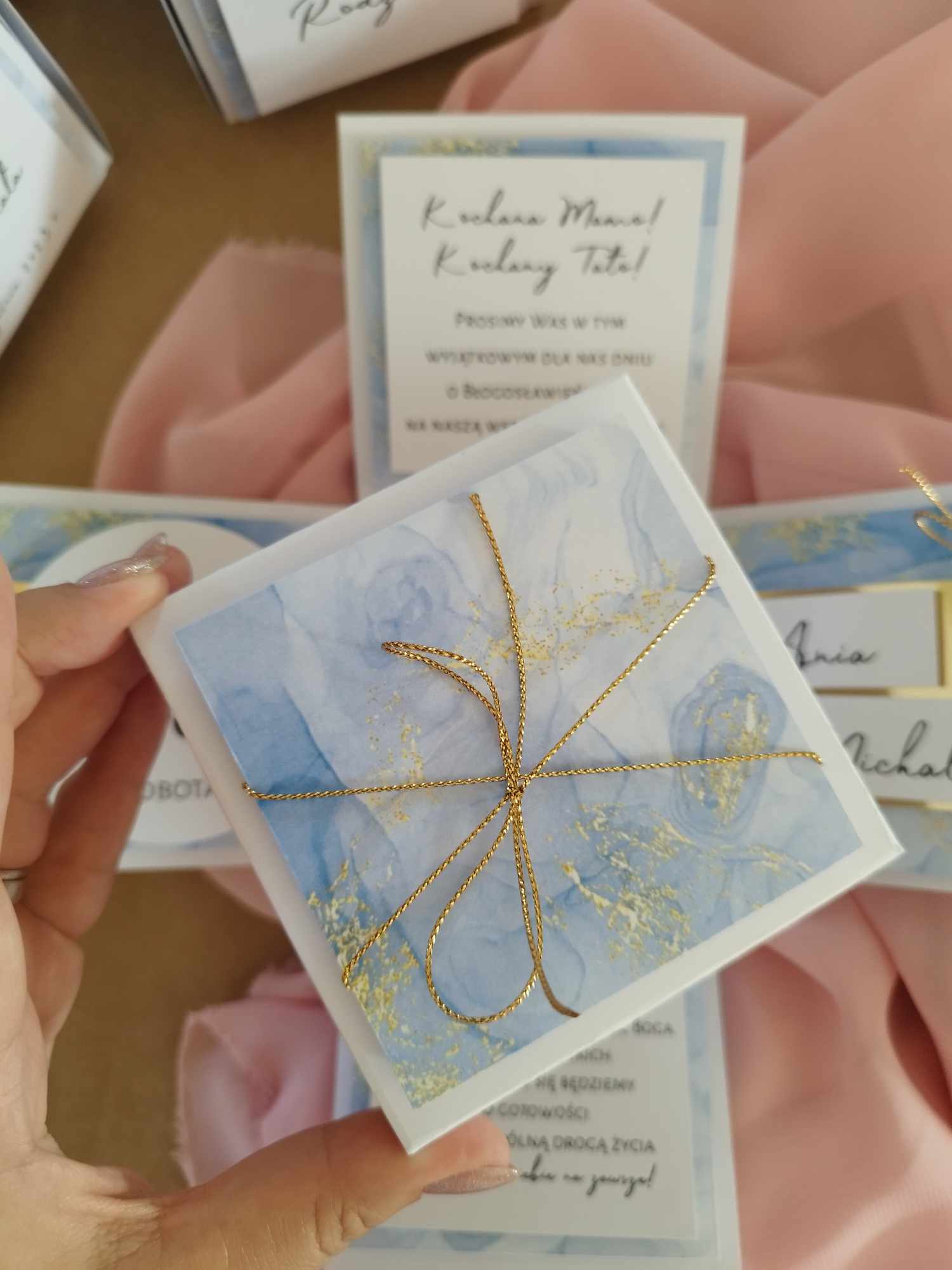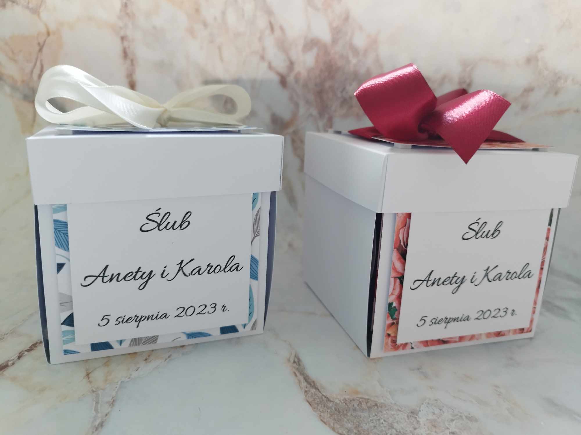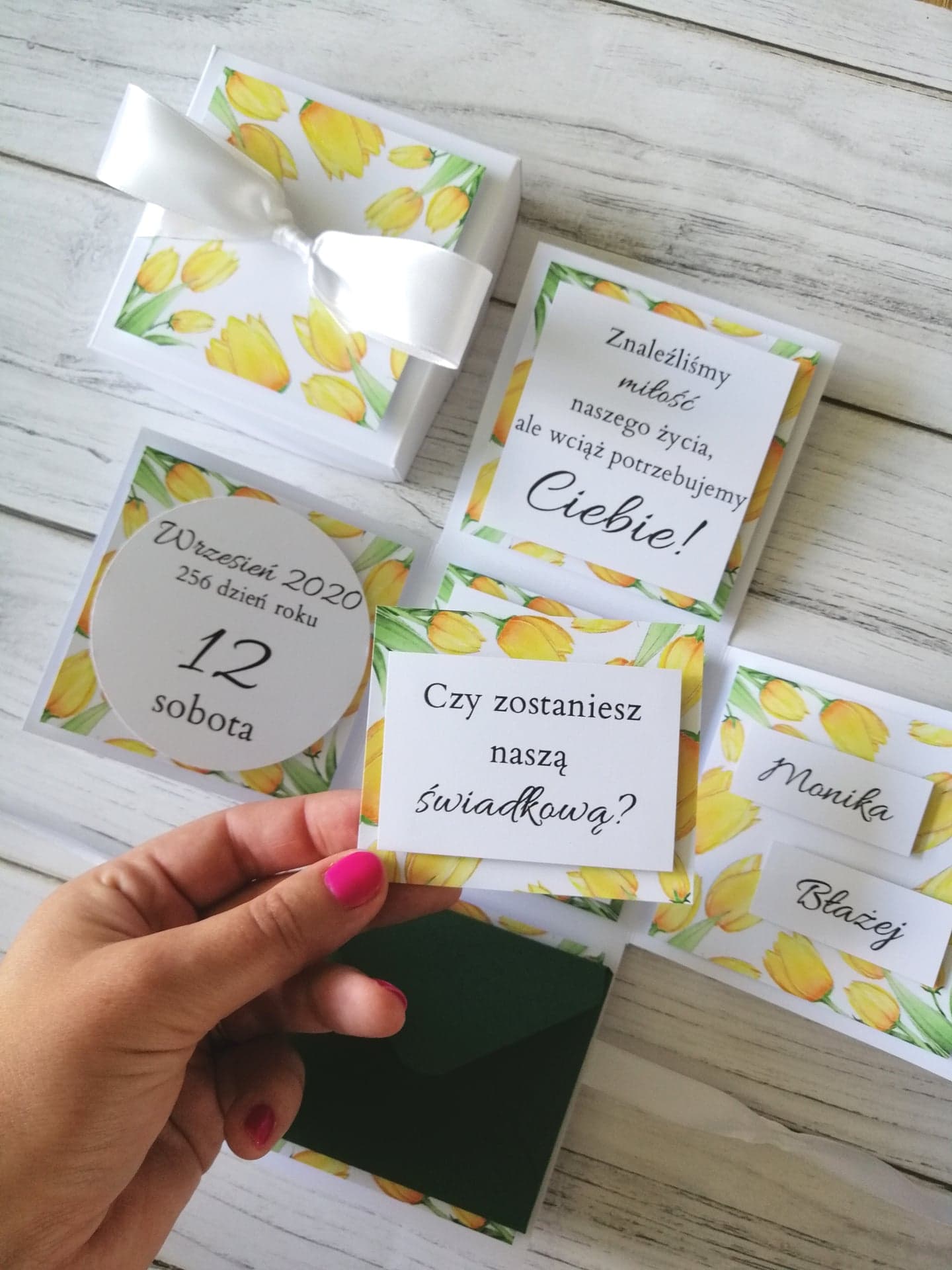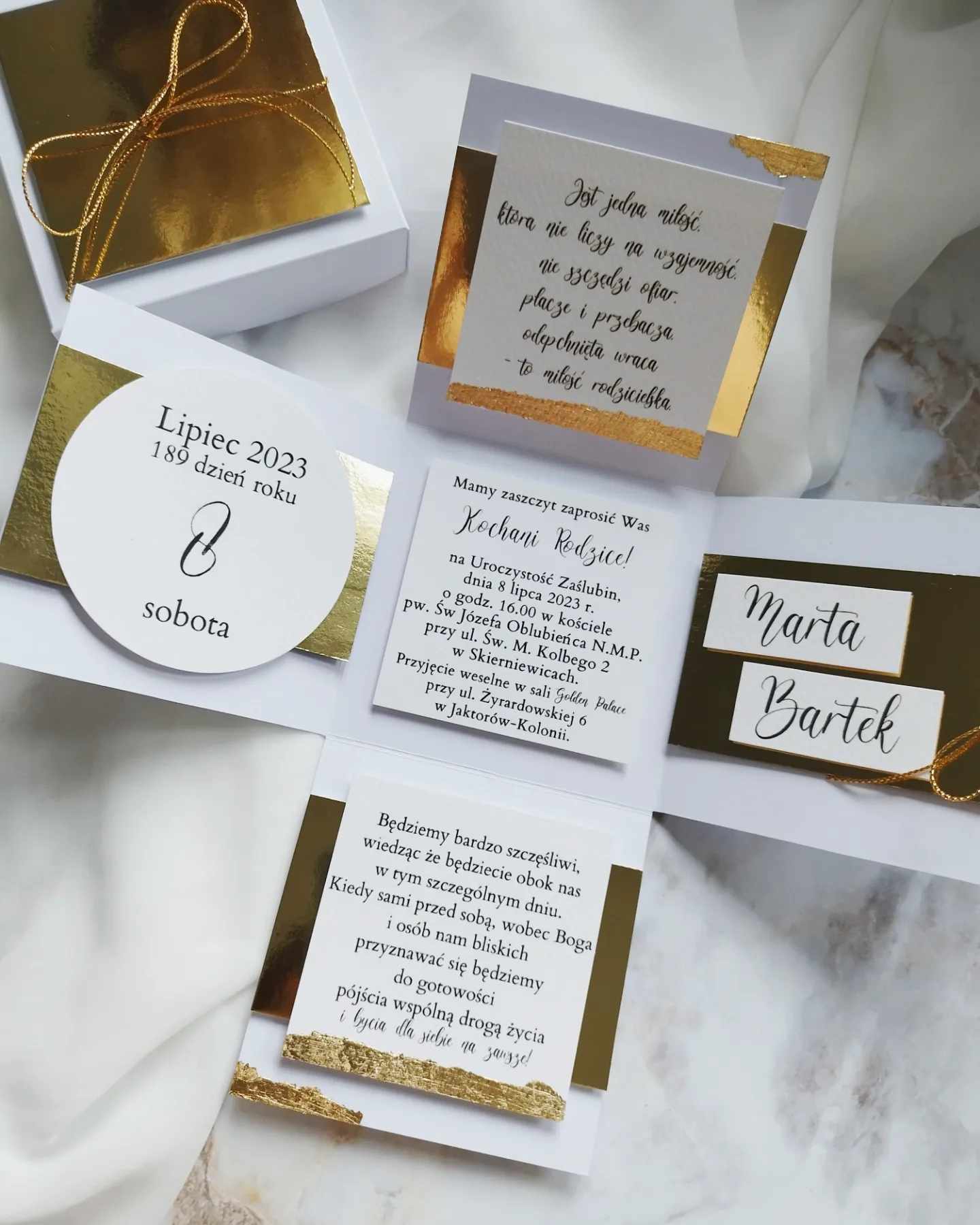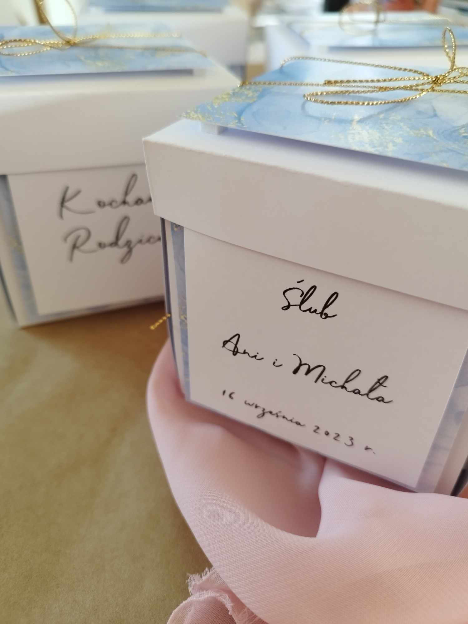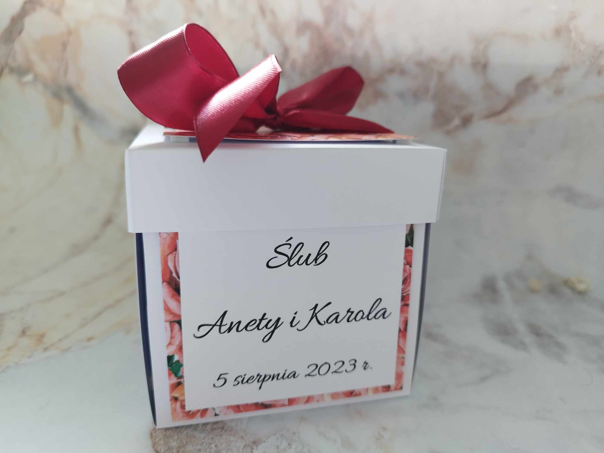 Zaproszenie dla Rodziców, Dziadków, Świadków w exploding box, o wymiarach 9 cm na 9 cm, po rozłożeniu 27 cm w motywie przewodnim zaproszeń. Może służyć również jako podziękowanie. Zawiera grafikę ślubną oraz teksty zaproszenia, podziękowania, prośbę o błogosławieństwo.