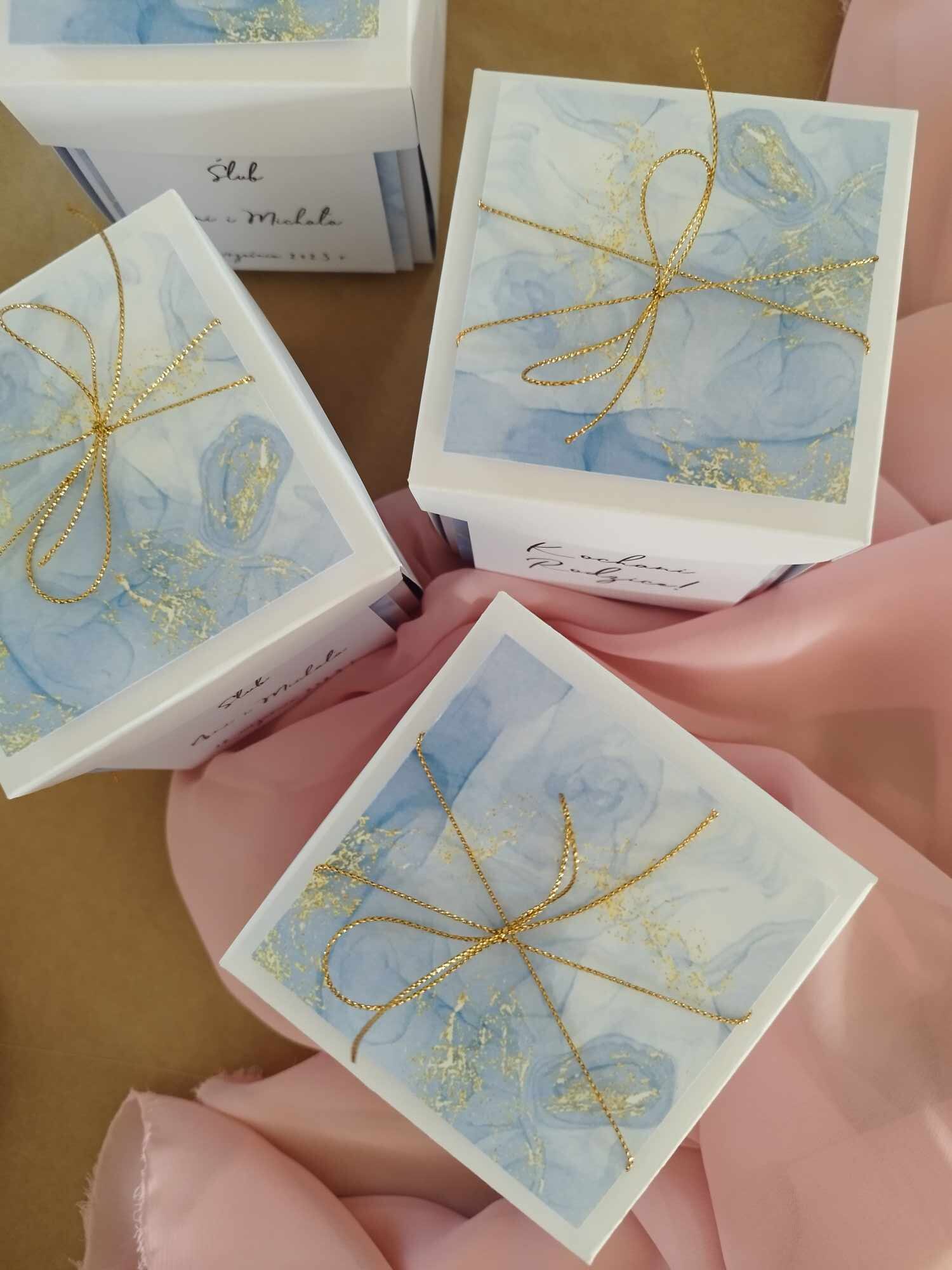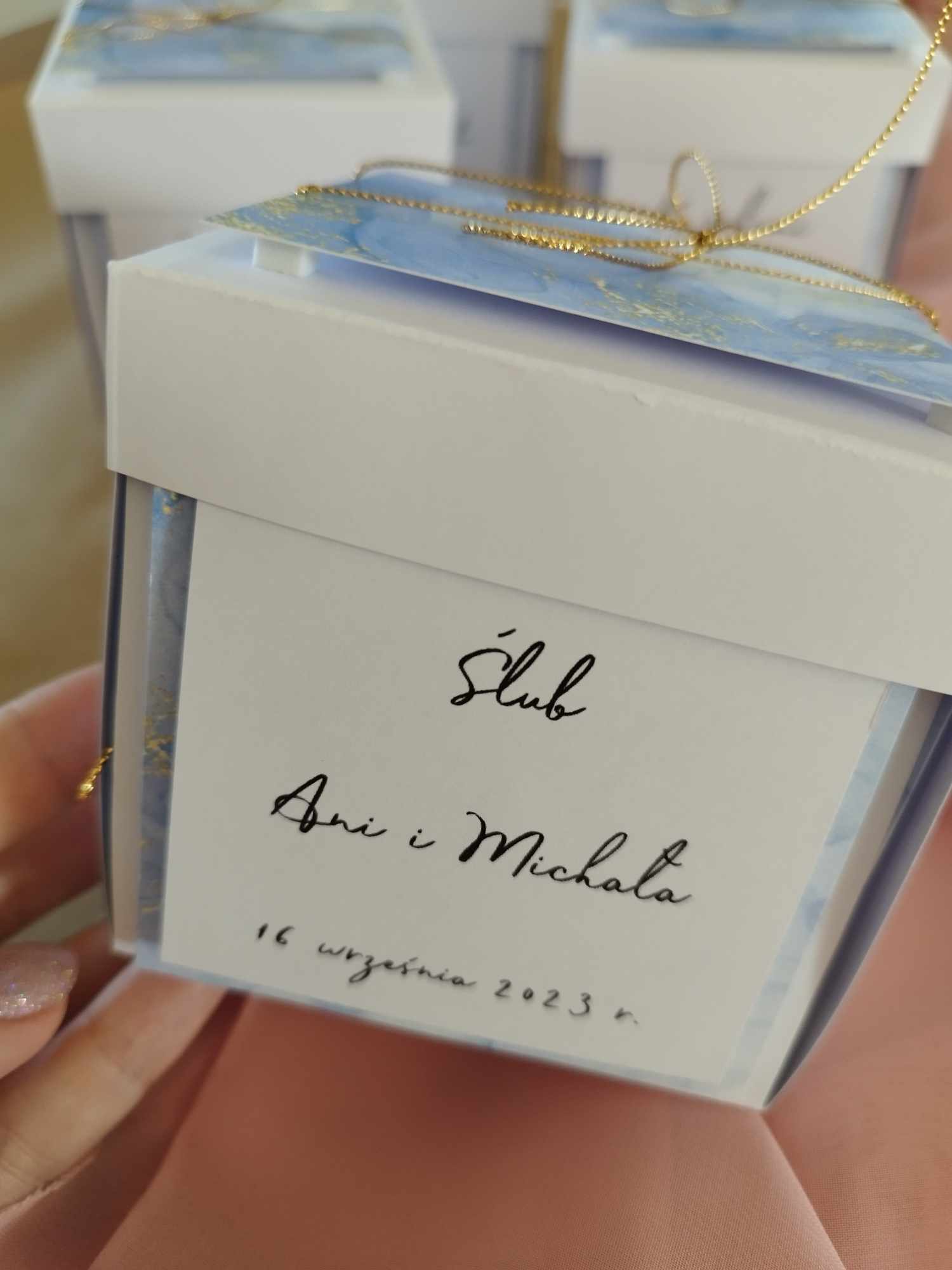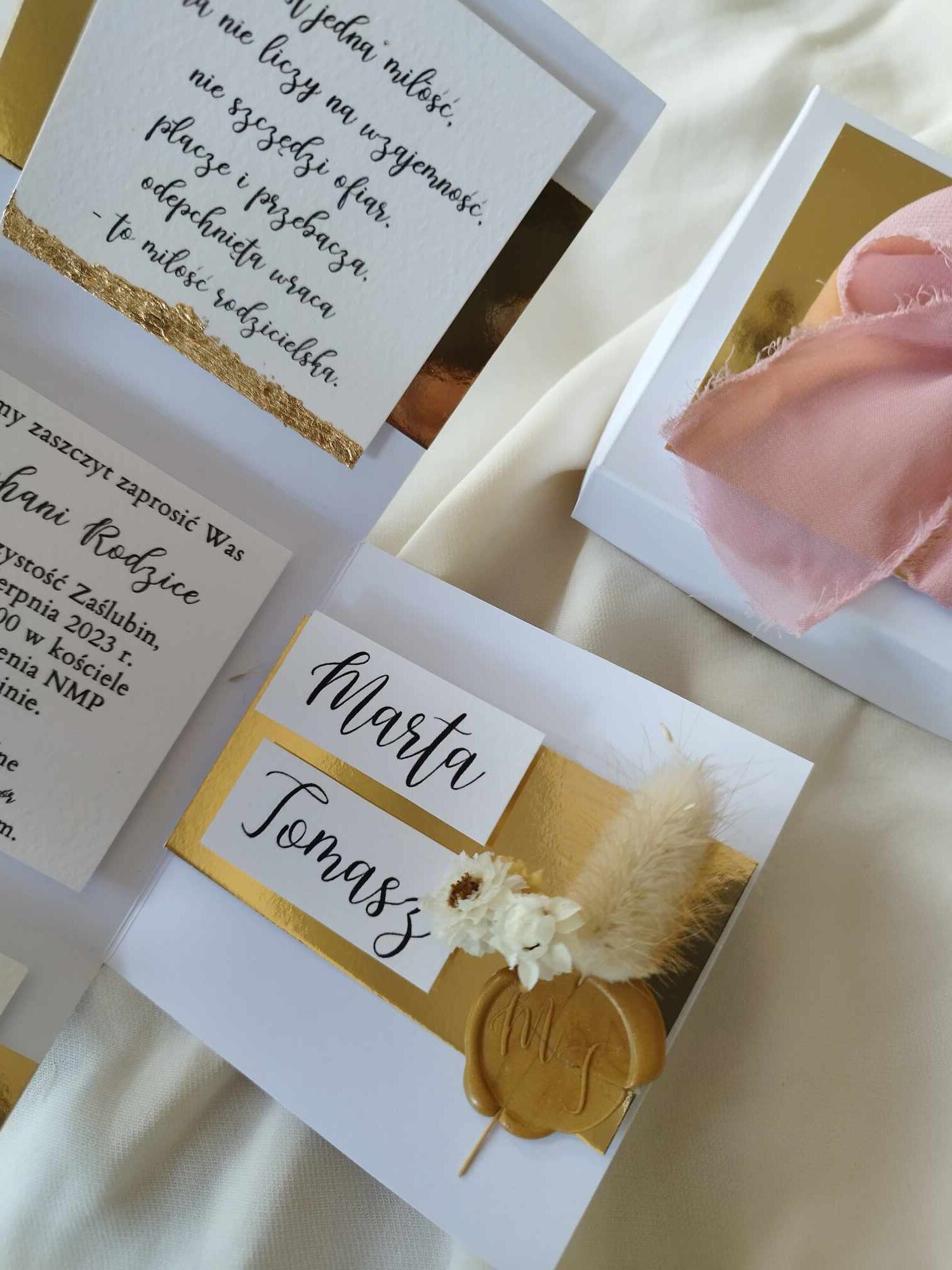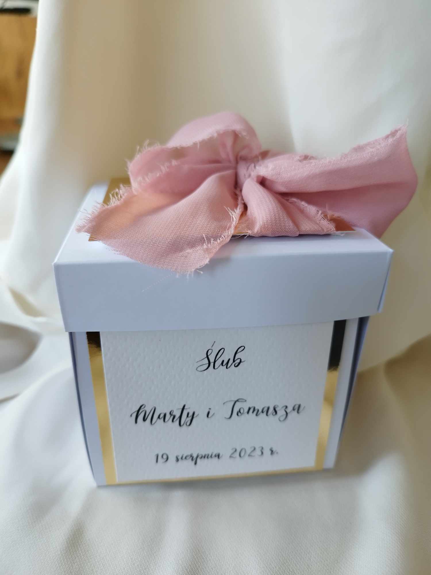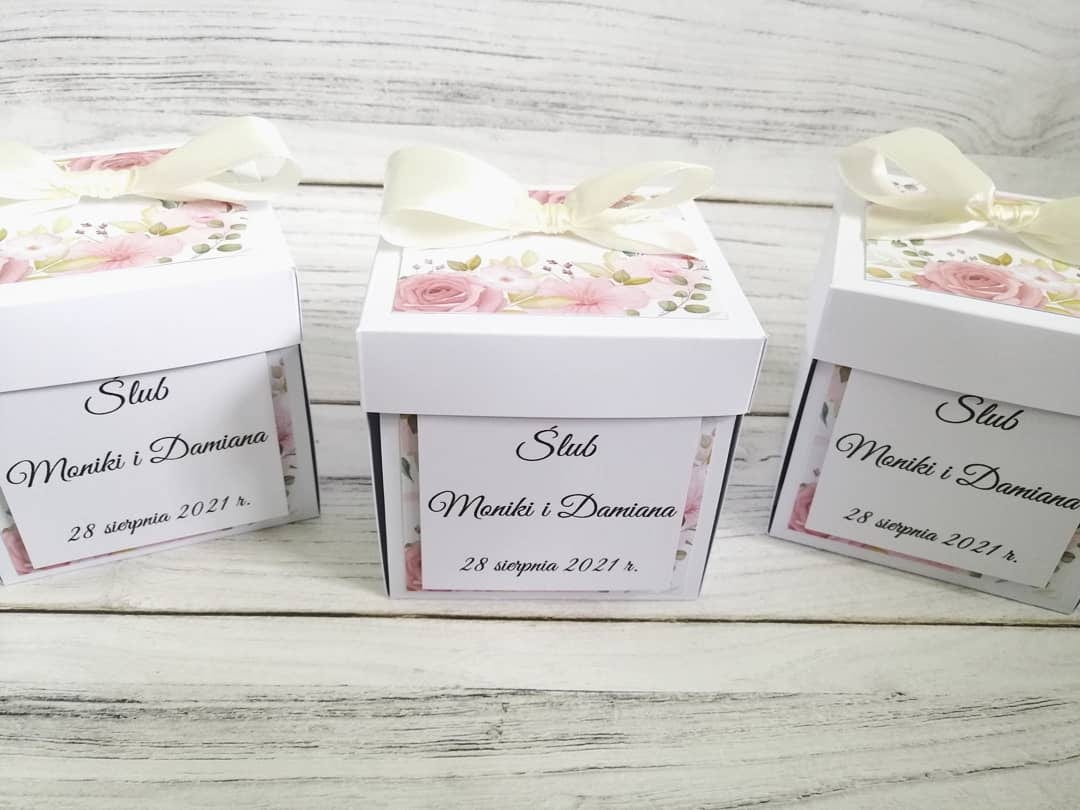 Zaproszenie dla Rodziców, Dziadków, Świadków w exploding box, o wymiarach 9 cm na 9 cm, po rozłożeniu 27 cm w motywie przewodnim zaproszeń. Może służyć również jako podziękowanie. Zawiera grafikę ślubną oraz teksty zaproszenia, podziękowania, prośbę o błogosławieństwo.