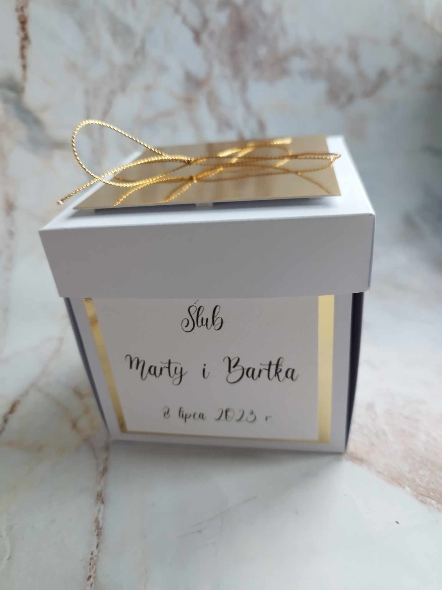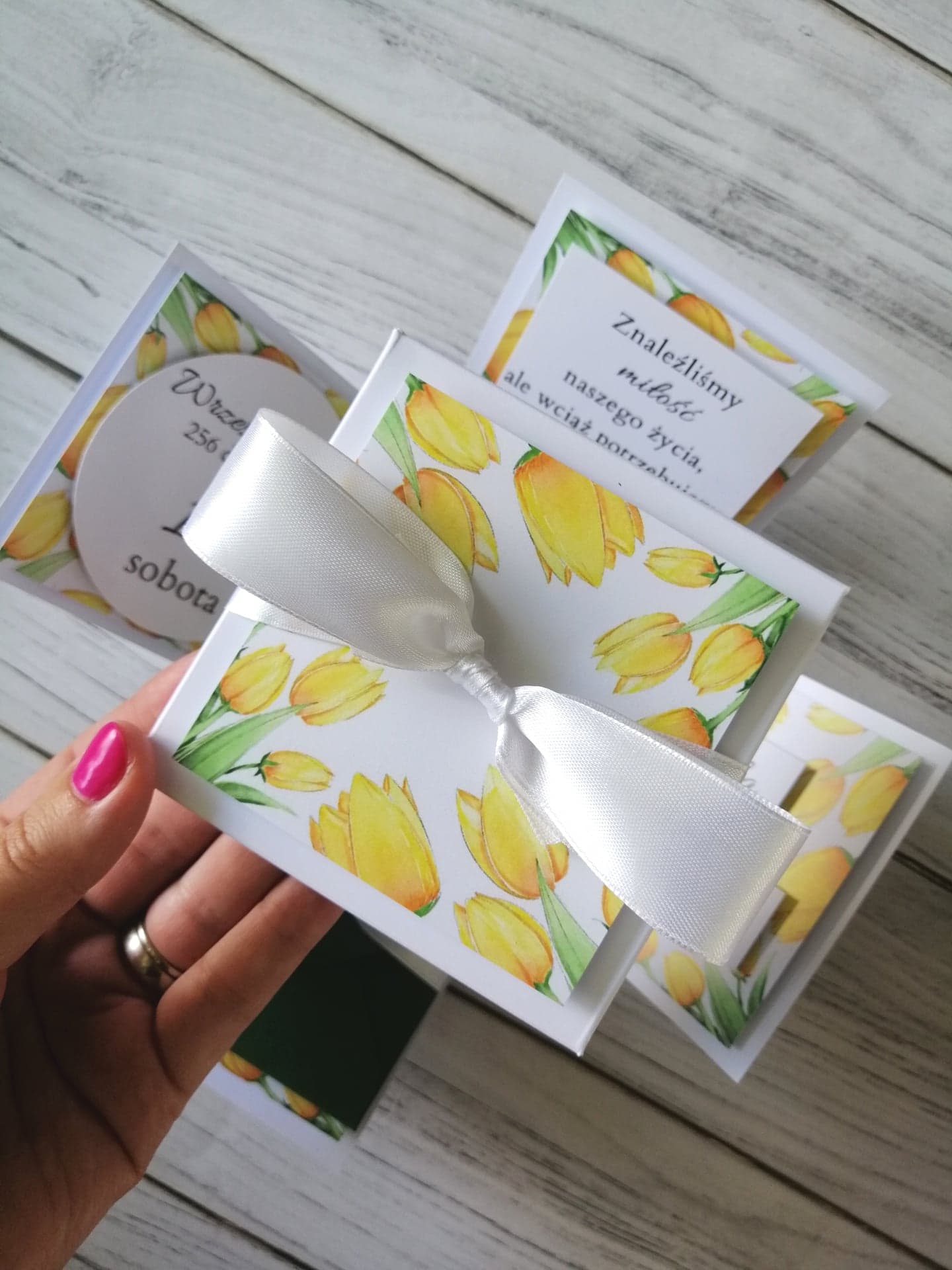 Zaproszenie w drewnianym pudełeczku, o wymiarach 12 cm na 16 cm, w motywie przewodnim uroczystości. Może służyć również jako podziękowanie. Zawiera grafikę ślubną oraz tekst zaproszenia/podziękowania. Zamykane na magnes.